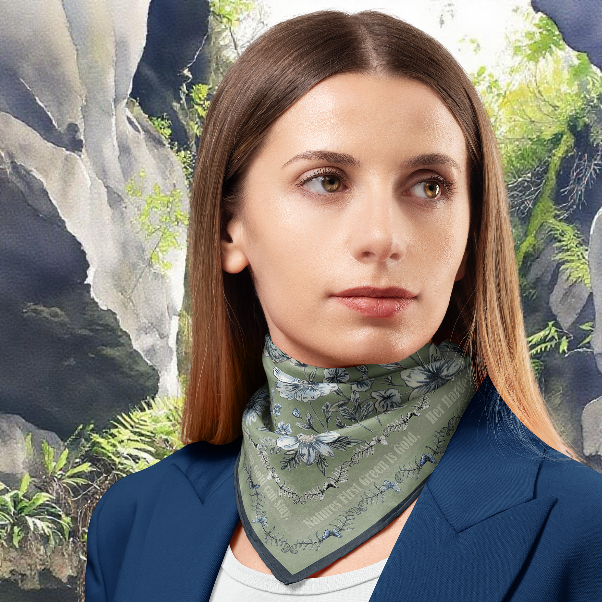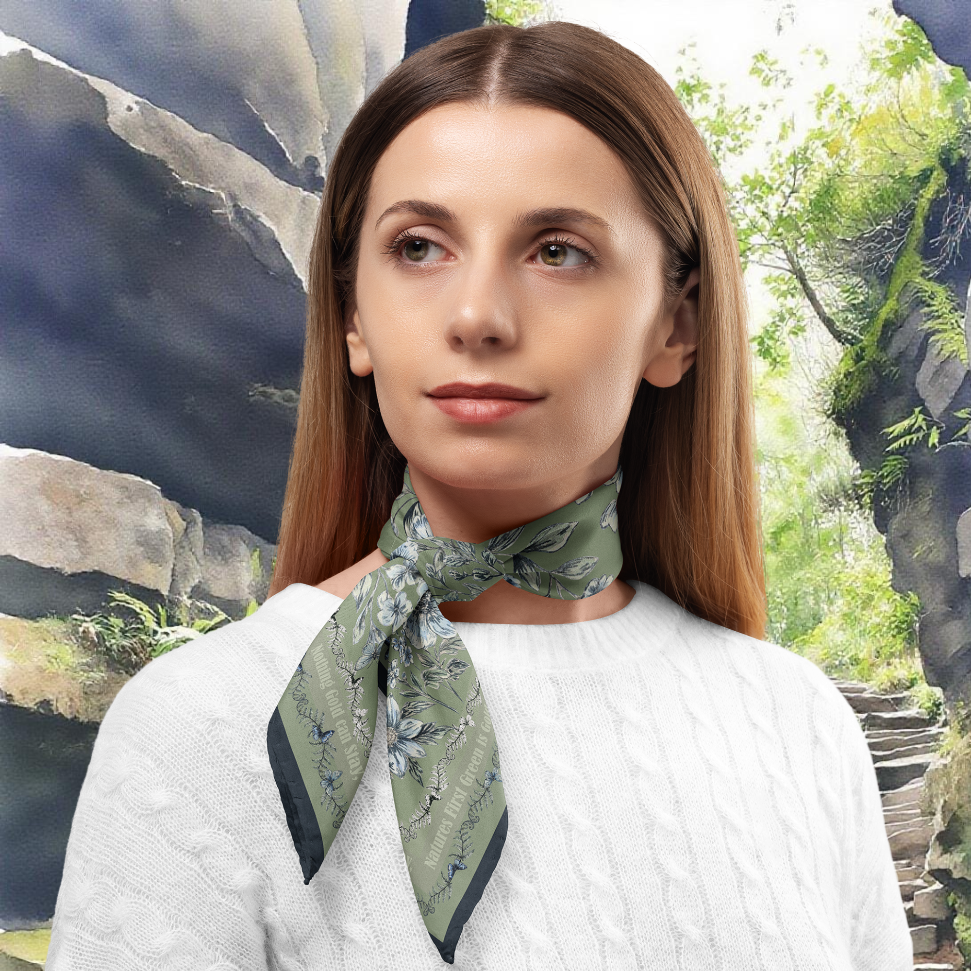 The Luds Church – Floral scarf is a romantic ode to Derbyshire’s wild sanctuaries, where woodland paths unfurl like poetry and the hush of nature stirs the imagination. Delicate blue and cream wildflowers bloom across a sage-green ground, flanked by a dusky navy blue border adorned with fluttering butterflies and softly entwined script. Each element is placed with intention, evoking the feeling of stumbling upon a secret in the woods — fleeting, magical, and wholly enchanting.